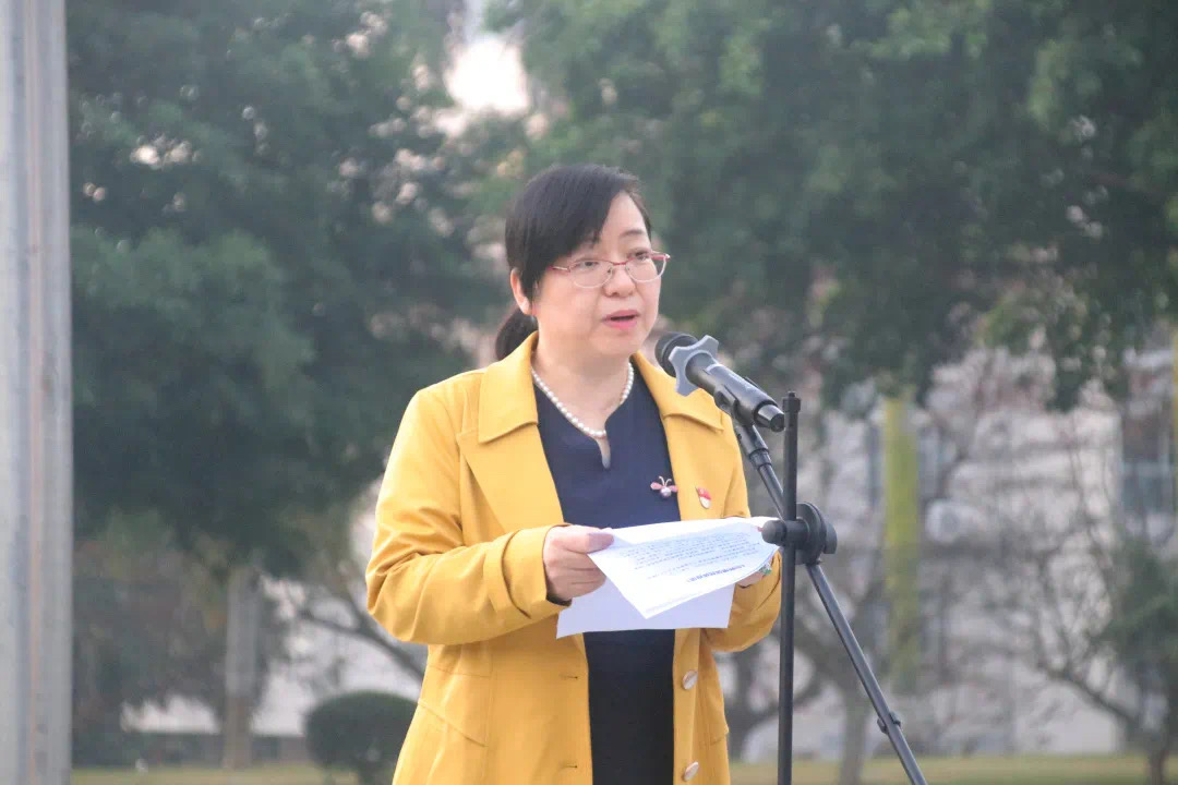 党委书记陈伟斌主持。国旗护卫队迈着整齐划一的步伐,护送国旗到达升旗台。伴着慷慨激昂的《义勇军进行曲》,在全体师生的注目下,鲜艳的五星红旗在空中冉冉升起。升旗完毕,教工代表、黑丝