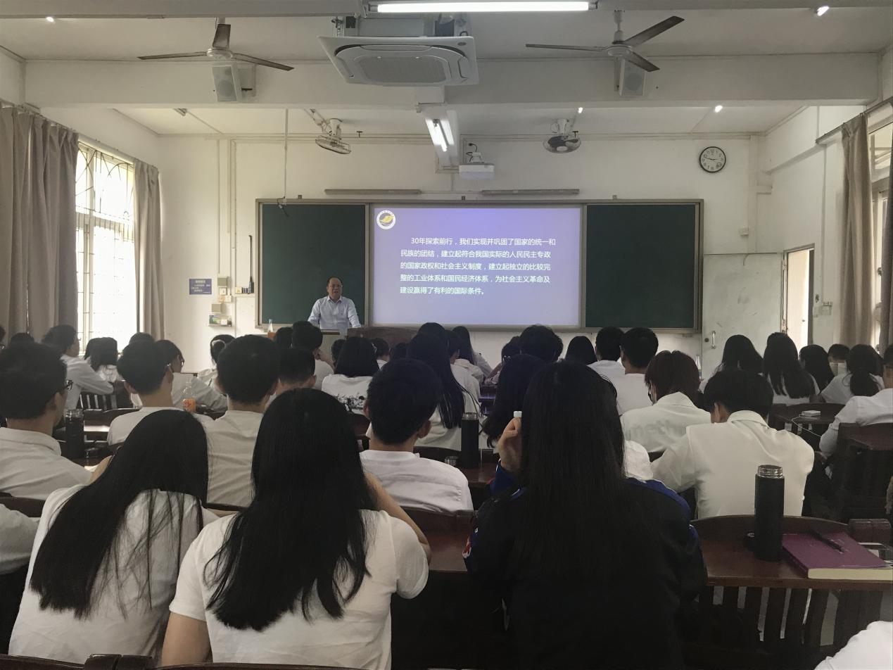 陈伟斌以“新中国主要发展历程、成就与启示”为主题,带领同学们回顾了新中国发展历程,特别提到了“抗美援朝精神”与“两弹一星精神”,要求同学们传承与发扬革命老辈“英勇顽强、舍生忘死”与“舍小家,为大家”的精神。在讲述新中国发展取得的伟大成就的时候,陈伟斌从经济总量、居民收入、科技实力、国防建设等12个方面展示了祖国发生的翻天覆地的变化。最后,从坚持中国特色社会主义制度、坚持中国共产党领导、坚持改革开放、始终代表人民群众四个方面总结了新中国发展的经验启示,并向同学们勾画了中国未来的美好图景。