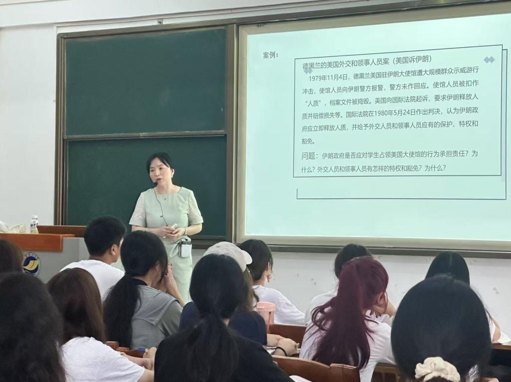 授课环节中,张艾妮老师依据教学大纲、教学日历的安排主讲课程《国际法学》的特定章节,综合使用案例分析、法考真题解析、视频播放等方式,对课程内容系统讲授,重点清晰,简洁明快。充分利用学习通的互动平台开展教学活动等,激发了学生参与学习的兴趣与热情。