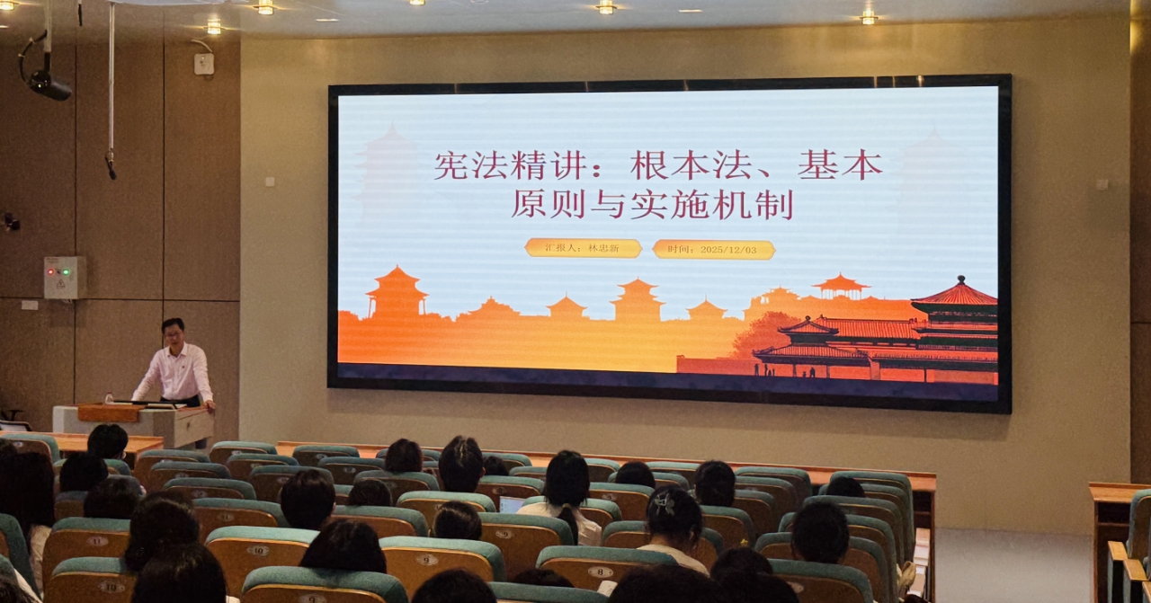 12月3日下午,学院党委书记林忠新为学院学生作了《宪法精讲:根本法、基本原则与实施机制》的专题宣讲。