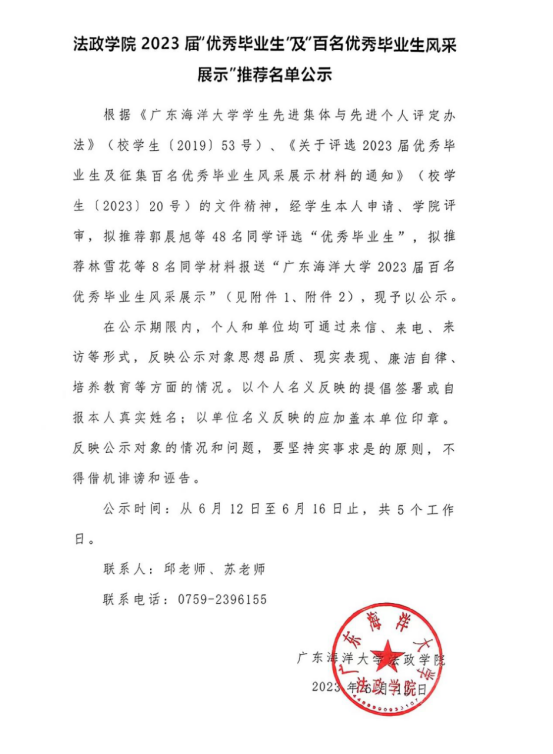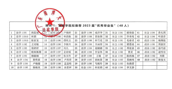 学生先进集体与先进个人评定办法》(校学生〔2019〕53号)、《关于评选2023届优秀毕业生及征集百名优秀毕业生风采展示材料的通知》(校学生〔2023〕20号)的文件精神,经学生本人申请、学院评审,拟推荐郭晨旭等48名同学评选“优秀毕业生”,拟推荐林雪花等8名同学材料报送“黑丝